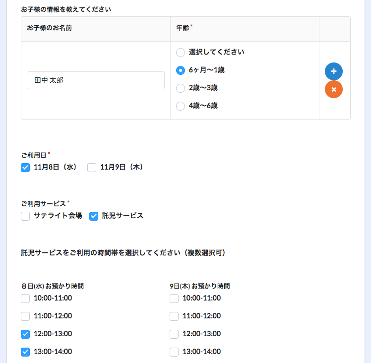 フォームの中に条件分岐を設定している。「託児サービス」を選択した方にだけ、「お預かり時間」を表示する