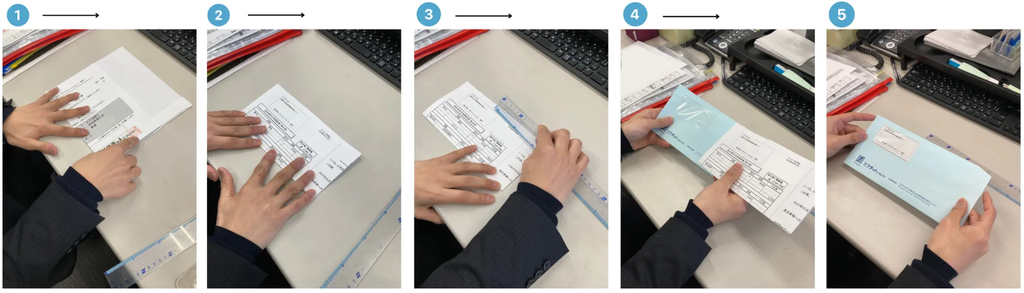 また、「退去精算書」と呼ばれる書類は従来全て郵送で対応していました。B4サイズで特殊な折り方をして封筒に入れて送る必要があり、一つひとつ手作業で対応しなければいけないため、2〜3月の繁忙期では送付完了までに1ヶ月半かかっていました。