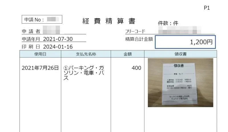 kintoneマスタデータをもとにPrintCreatorで出力した経費精算書。写真挿入も可