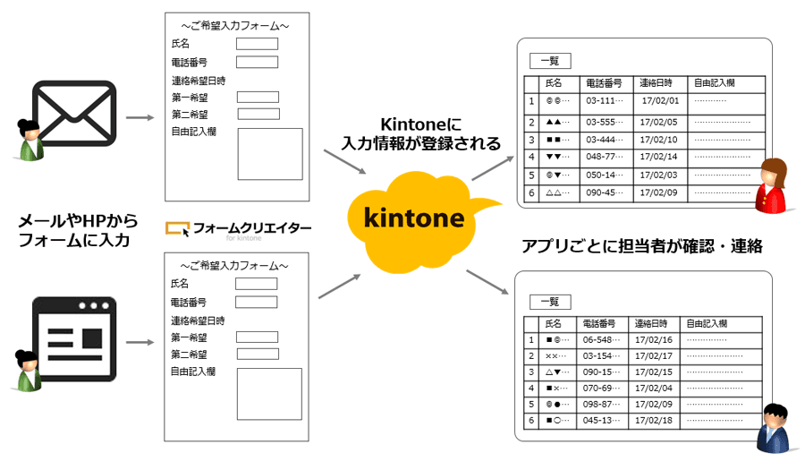 「主に登録している方へ向けて、この日に研修を行います、参加できますか?というような内容から、就業者への満足度調査や、登録者へ現在の求職状況の確認など、kintoneのアプリから、複数のアンケートフォームを作って運用しています。「データがkintoneに登録された後は、アプリごとに担当を分けているので、フォローが必要な場合は漏れなく、メールや電話等で連絡を行っています。」