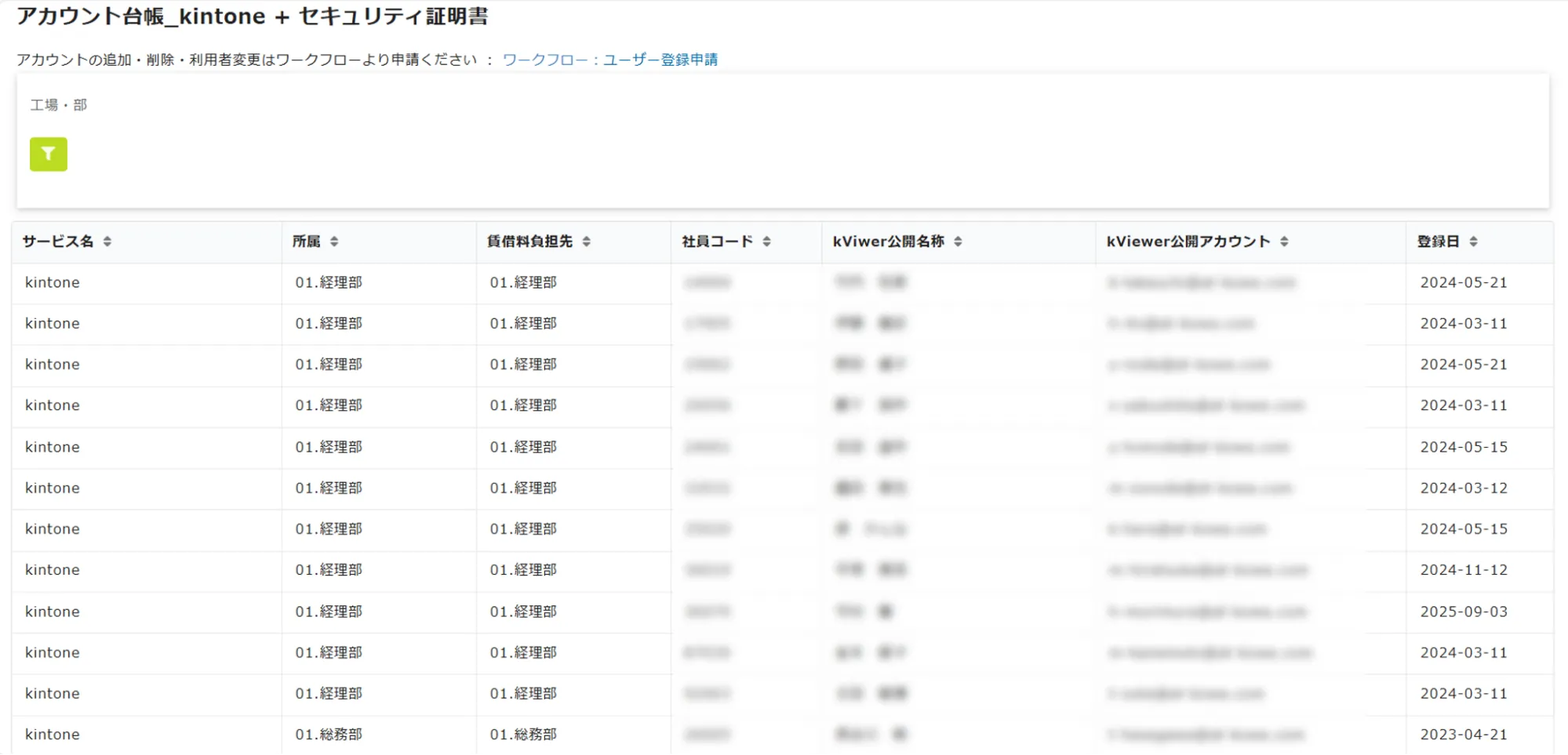 ▲kViewerで公開されている各システムのアカウント台帳。各アカウントが誰に付与されているのかが一覧で確認できる。