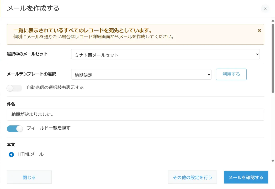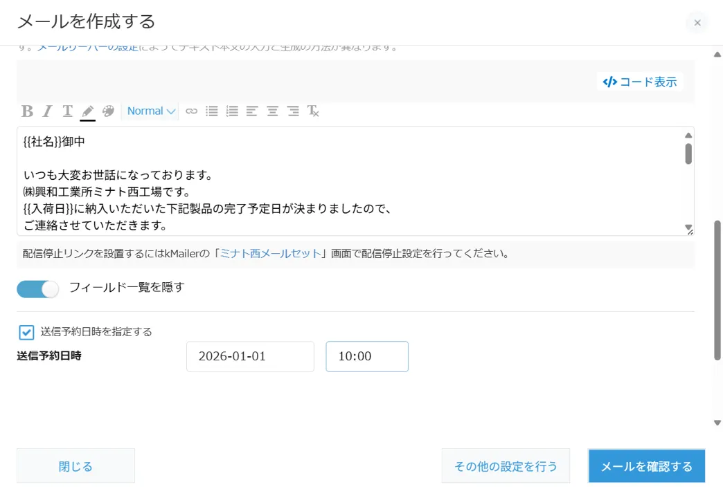 この課題を解決するため、同社はkMailerを使った納期通知の一括送信システムを構築。基幹システムのデータをkintoneに取り込み、予約機能を活用して毎日自動で予定日や完了情報を一斉送信できる仕組みを整えました。さらに、送信メールには引き取りの際の来社予約のURL案内を加えることで、顧客対応をスムーズにしました。