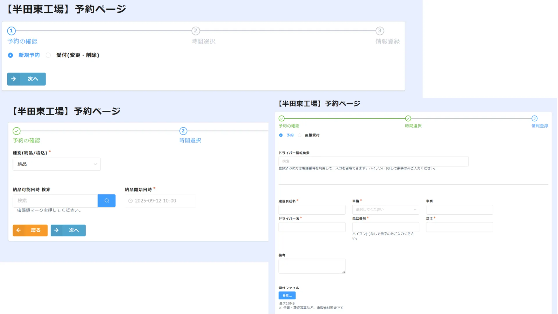 このシステムは、工場で働く社員から「お客様の来場予約をもっとスムーズに管理したい」という声を受けてスタートしました。既存の連携ツールでの対応も検討しましたが、更新は15分に1回のみ。予約が重複するリスクが想定されました。