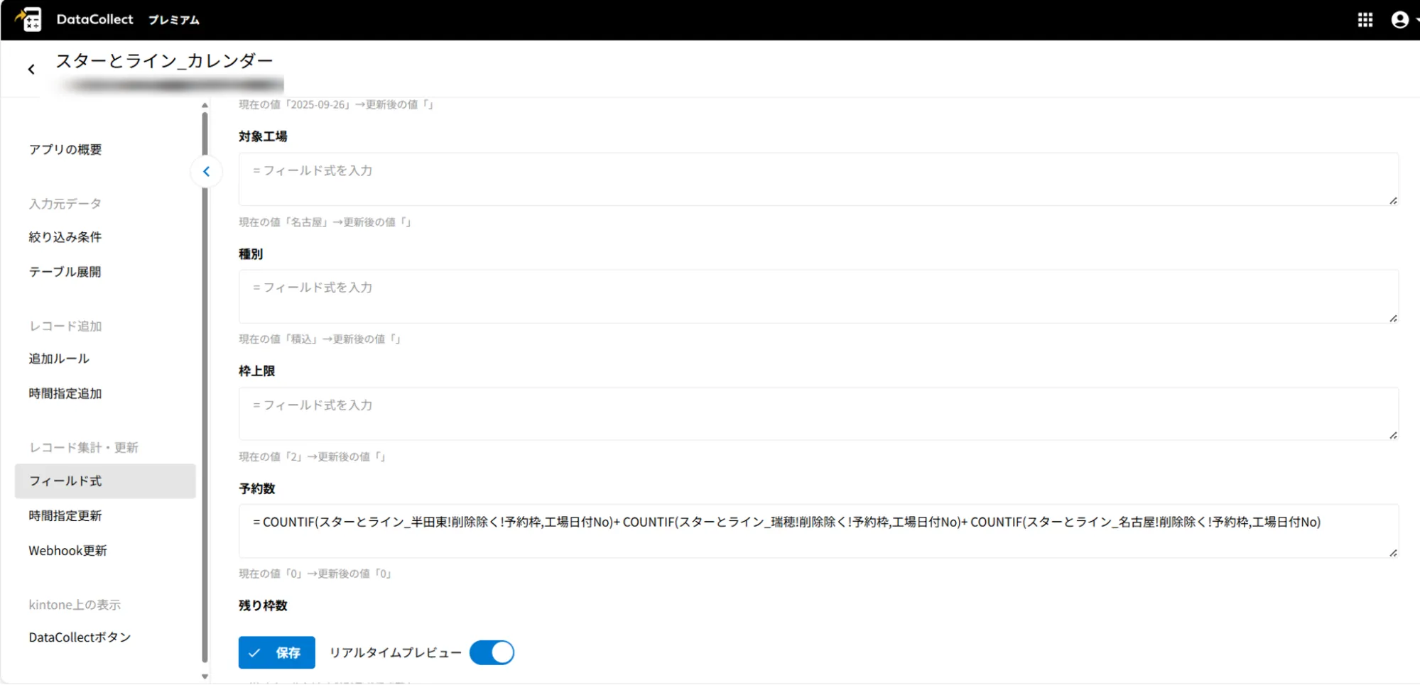 ▲kintoneの予約数管理アプリ画面。枠数と現在の予約数に応じて残り枠数が自動計算され、FormBridgeやkViewerに反映される。