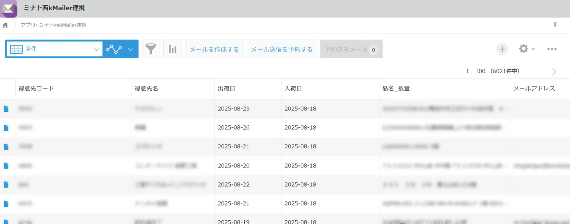 ▲出荷日や入荷日を管理するkintoneアプリ画面。予定日や完了情報に合わせてメールを一斉送信できるようkMailerを連携。