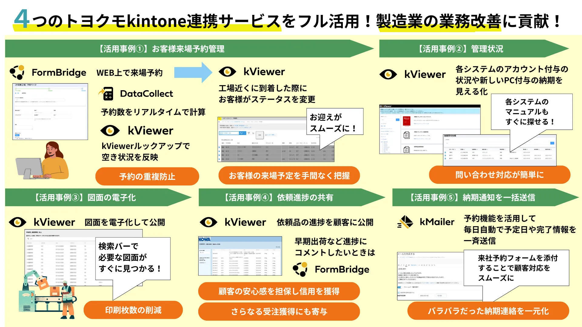 一方で、kintoneアカウントを持たない社員や外部関係者に「情報だけ伝えたい」というニーズがあり、以前から情報共有のハードルの高さが課題でした。こうした背景から、kViewerを皮切りにFormBridge、kMailer、DataCollectといったトヨクモkintone連携サービスを導入。現在では複数のツールを組み合わせ、業務ごとに最適な仕組みを整えています。