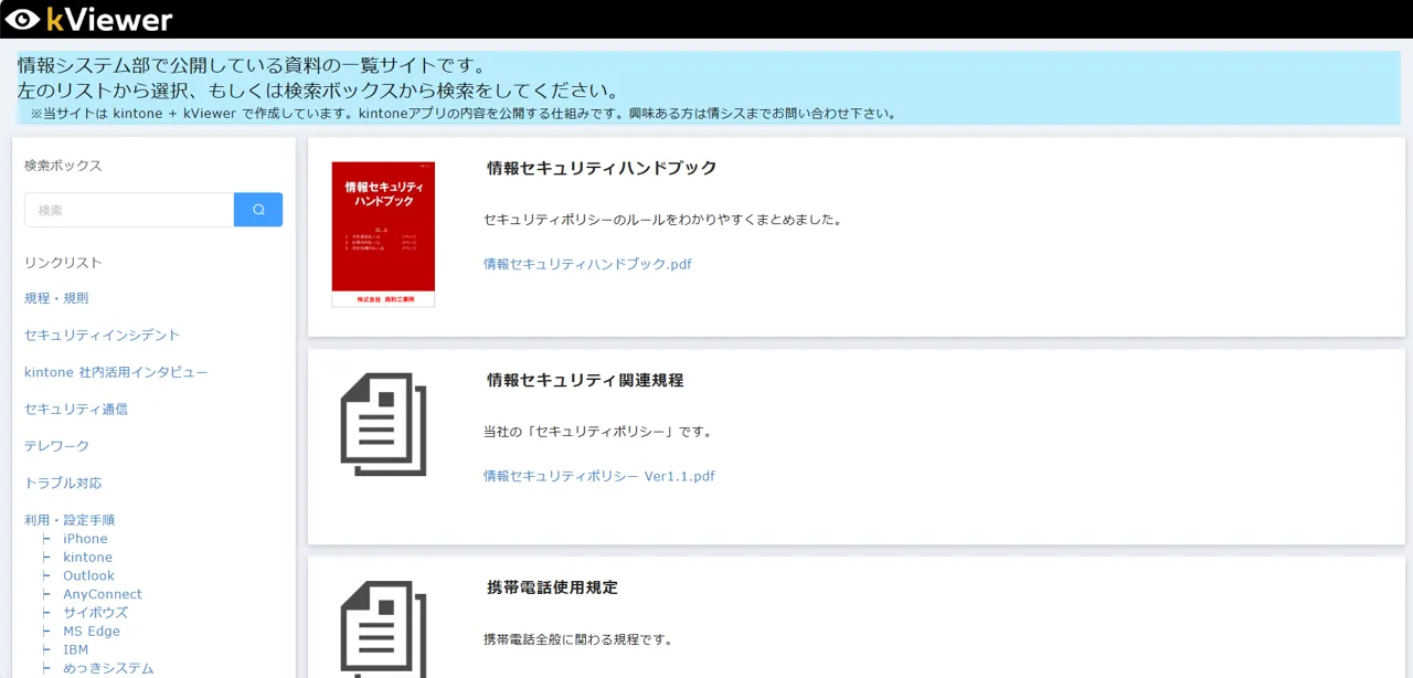 マニュアルやスマホ設定手順などをkViewerに集約し、社内イントラとして活用した