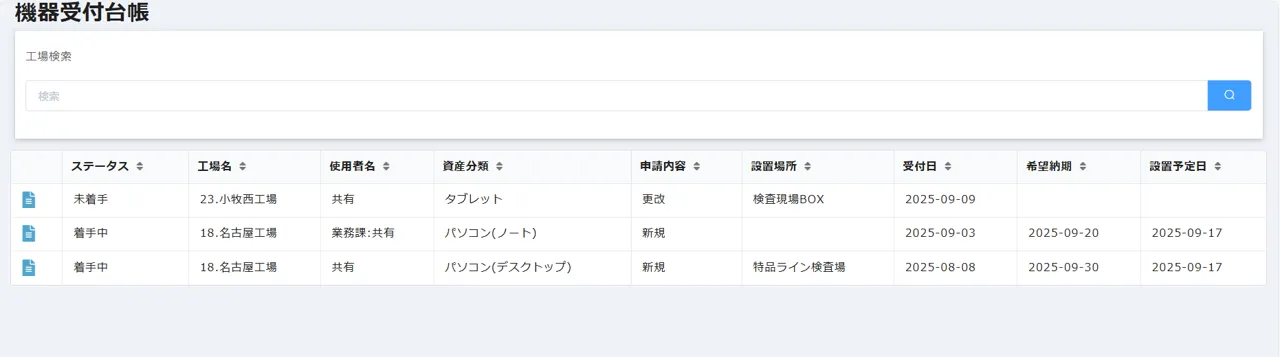 同社では社内に複数のシステムを導入しているため、「誰がどのシステムのアカウントを持っているのか」「自分の工場に割り当てられているアカウント数はどれくらいか」といった問い合わせが情報システム部に集中していました。さらに、新しいPCの手配やセットアップの進捗についても「いつ届きますか」と確認されることが多く、担当者の負担になっていました。