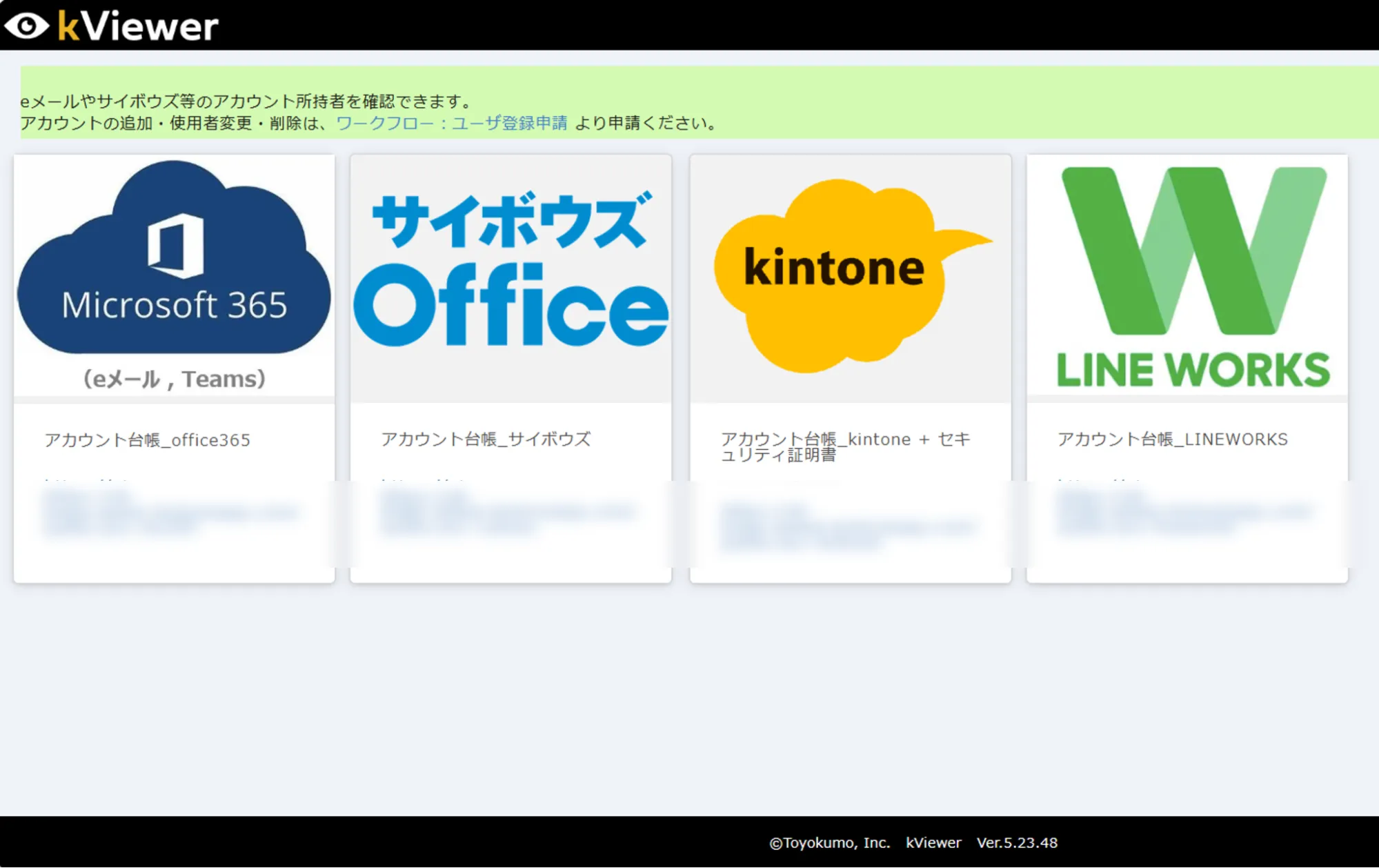 また興和工業所では、さまざまな情報の共有にkViewerを活用しています。その一つがkintoneをはじめとした業務で利用するシステムの管理状況の見える化です。