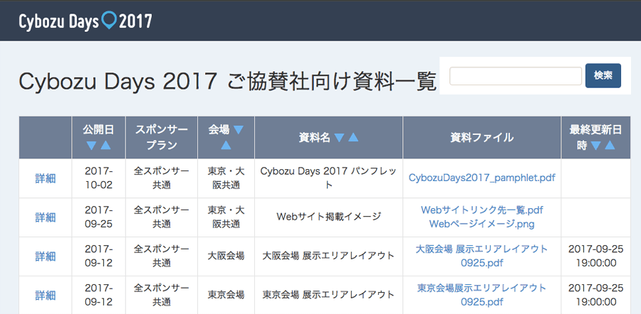 「また、kViewerでは、公開する一覧ビュー毎に、絞込条件を設定することができるので、『申込前』『申込後』に協賛企業様を分けて資料提供できるという点でも活用できました。『申込前』の方には、申込用紙やイベント概要等の資料を、『申込後』の方にはマニュアルや当日のレイアウト資料などを共有しました。 これらを通常のWebページで実現しようとすると公開まで時間がかかってしまうのですが、kViewerはkintoneに添付した資料がリアルタイムに公開できるので、そのスピード感も気に入っている点の1つです。加えて、更新日や対象協賛社など、資料に付随する情報も一覧に出来るので、資料の整理がしやすくなりました。」