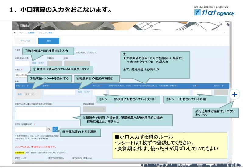 実際に社内で共有されている「経費申請」のマニュアル。操作画面と照らし合わせながら記入内容を確認できる