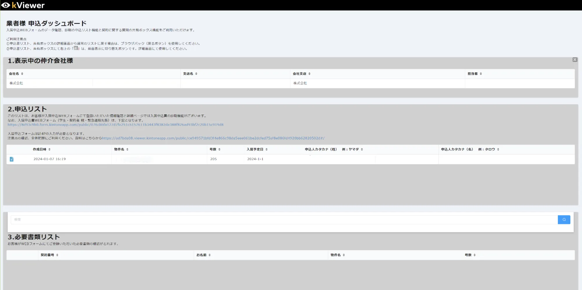 FormBridgeとkViewerを活用し、入居申込の受付や仲介業者との情報共有を行う「ダッシュボード」を構築した。