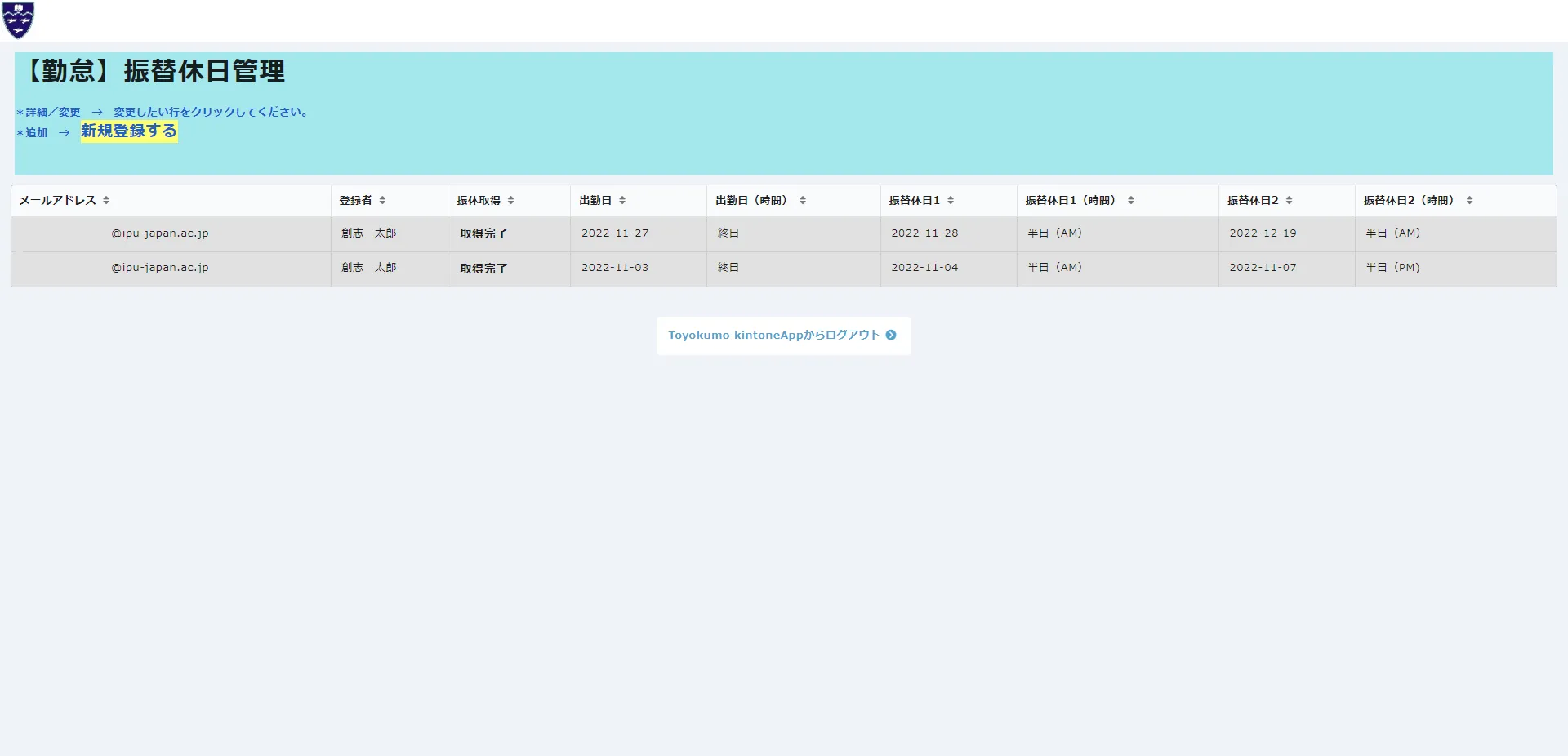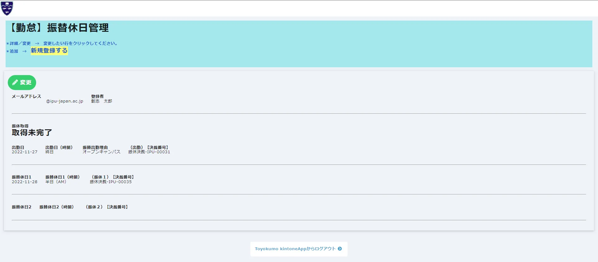 環太平洋大学では、kintoneとトヨクモ製品を活用して教職員の立替請求や有休・振替休日などの管理を行っていますが、「Toyokumo kintoneApp認証」の登録は、特に説明の場を設けるなどの手間はかけず、各自行ってもらう形としているそうです。