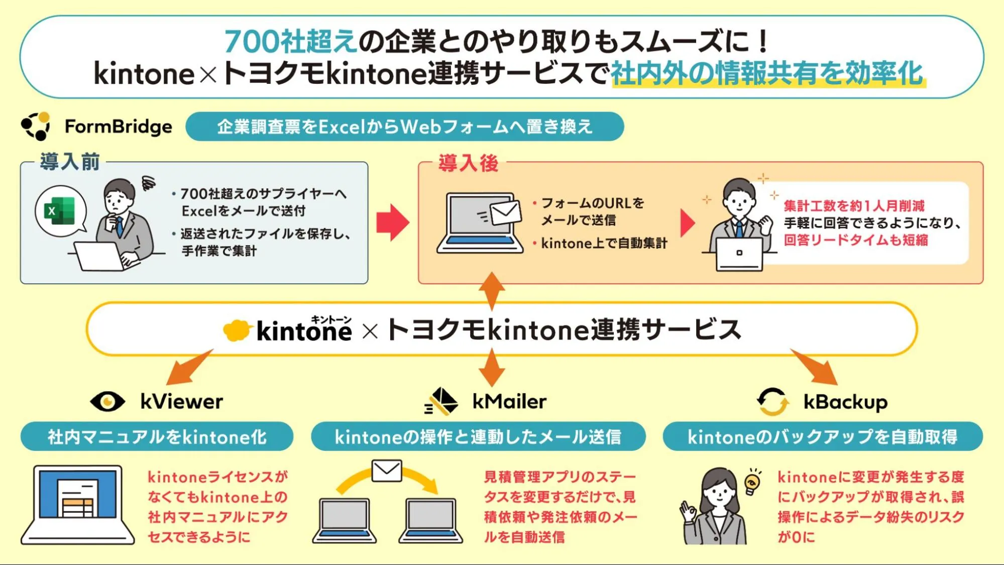 FormBridgeの導入により、700社からの回答リードタイム・集計工数を大幅削減!kintone×トヨクモkitnone連携サービスで社内外の情報共有を効率化