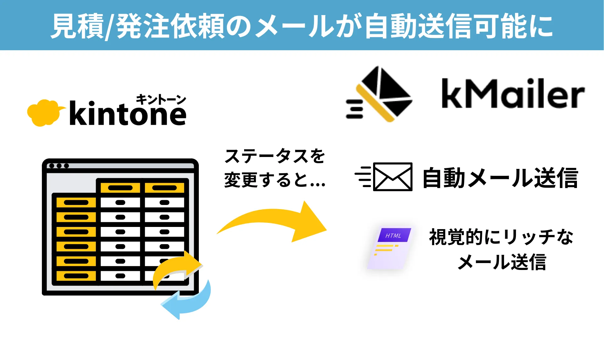 同社では、複数社から届く見積をkintoneアプリで管理しており、ステータスの変更や確認をkintone上で完結することができていました。しかし、kintoneの操作に連動した自動送信を行うことができなかったため、見積依頼や発注依頼が発生するたびにメールを作成する必要があり、担当者の負担になっていました。