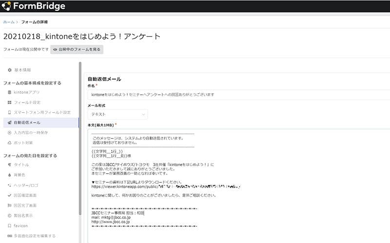 フォームブリッジの自動返信メールに資料のダウンロードURLを記載しています。