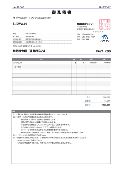 システム39は、kintoneで業務システムを作るというサービスになります。値段は39万円と決まっていて、1回2時間×全3回のサービスです。その場で、社内の業務を聞きながら、kintoneでシステム化したり、場合によってはその場でプリントクリエイターの設定をしたりとか、お客様の業務にあったシステムを作ります。初回の2時間は無料で、話を聞くだけじゃなくて実際に作ります。その場で作ったものをお渡しして、自社に持ち帰って試してもらってから、オッケーであればご発注をいただく形です。