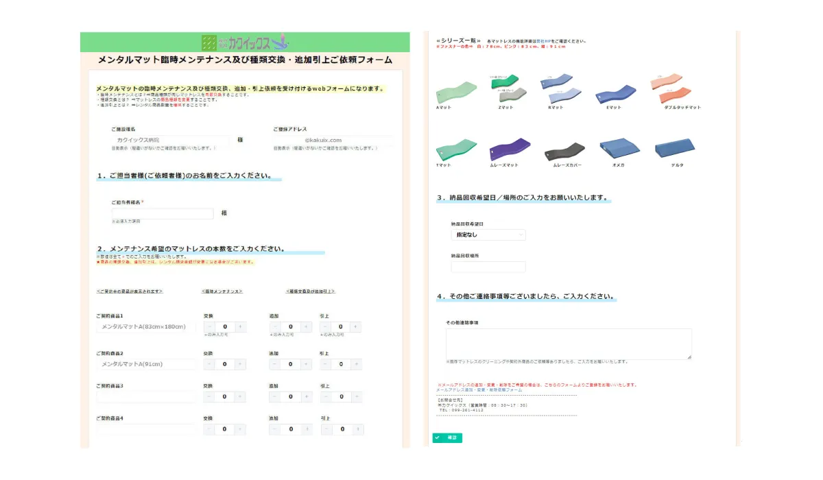 同社では、マットレスなどの製品のメンテナンス依頼にもFormBridgeを活用しています。FormBridge導入前は、全てのメンテナンス依頼を電話で受け付け、担当者がkintoneアプリに入力するフローを踏んでいました。そのため、電話を受けながら顧客からの依頼内容をkintoneアプリへ手入力する必要があり、担当者に負担がかかってしまっていたのです。