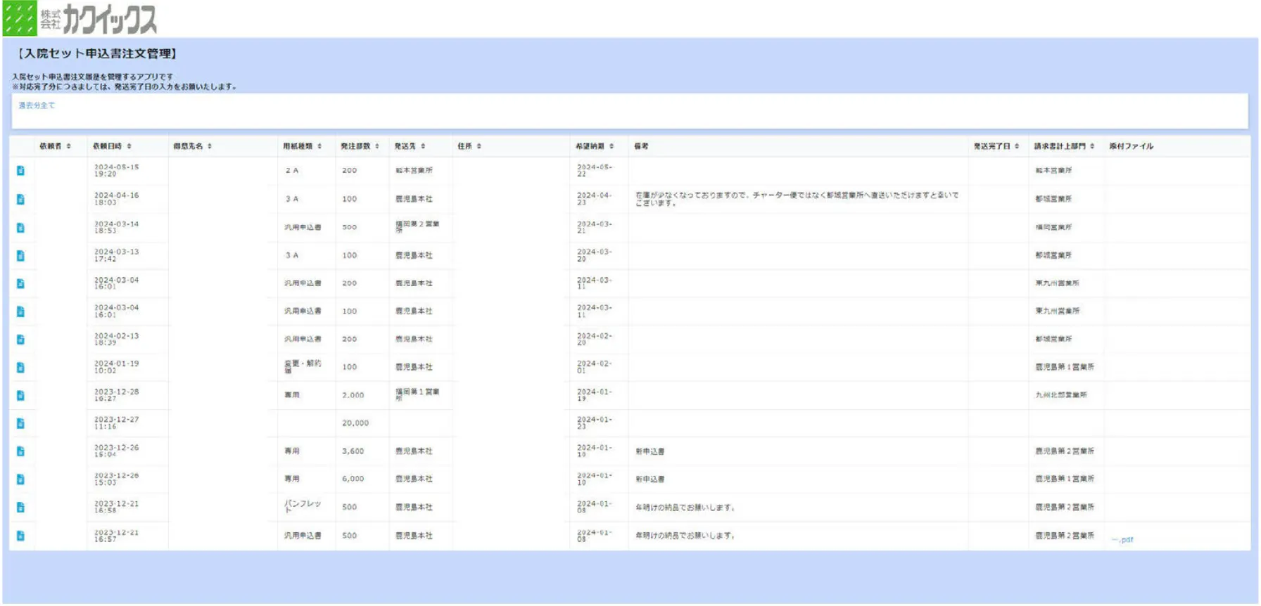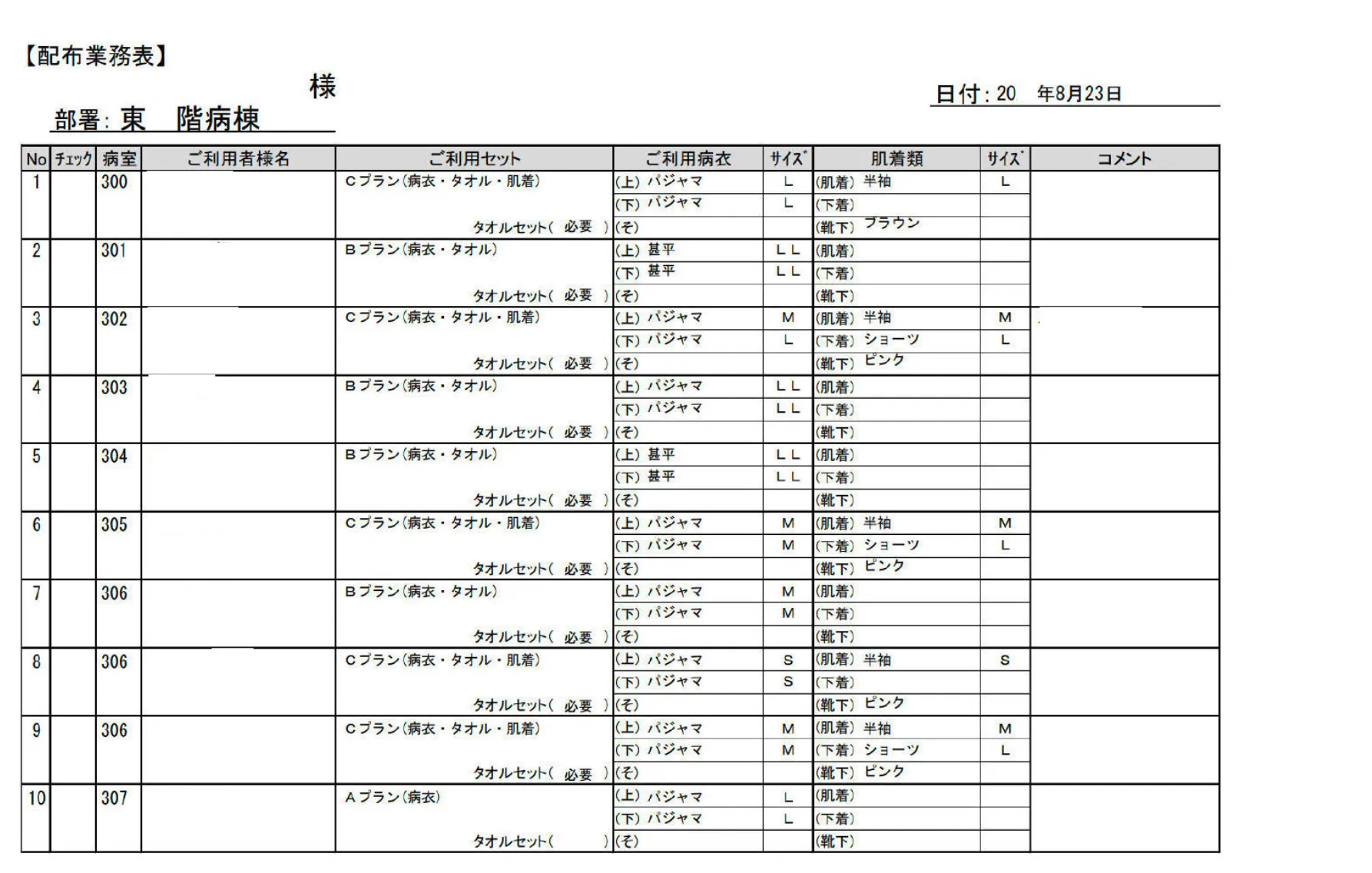 入院セットのレンタルサービスを提供する上で欠かせないのが、お客様に配布する物品が記載された配布業務表です。配布業務表は、現場のコンシェルジュが配布済みのチェックを付けたり、メモをしたりする際にも使用されるため、紙で出力することが必須でした。