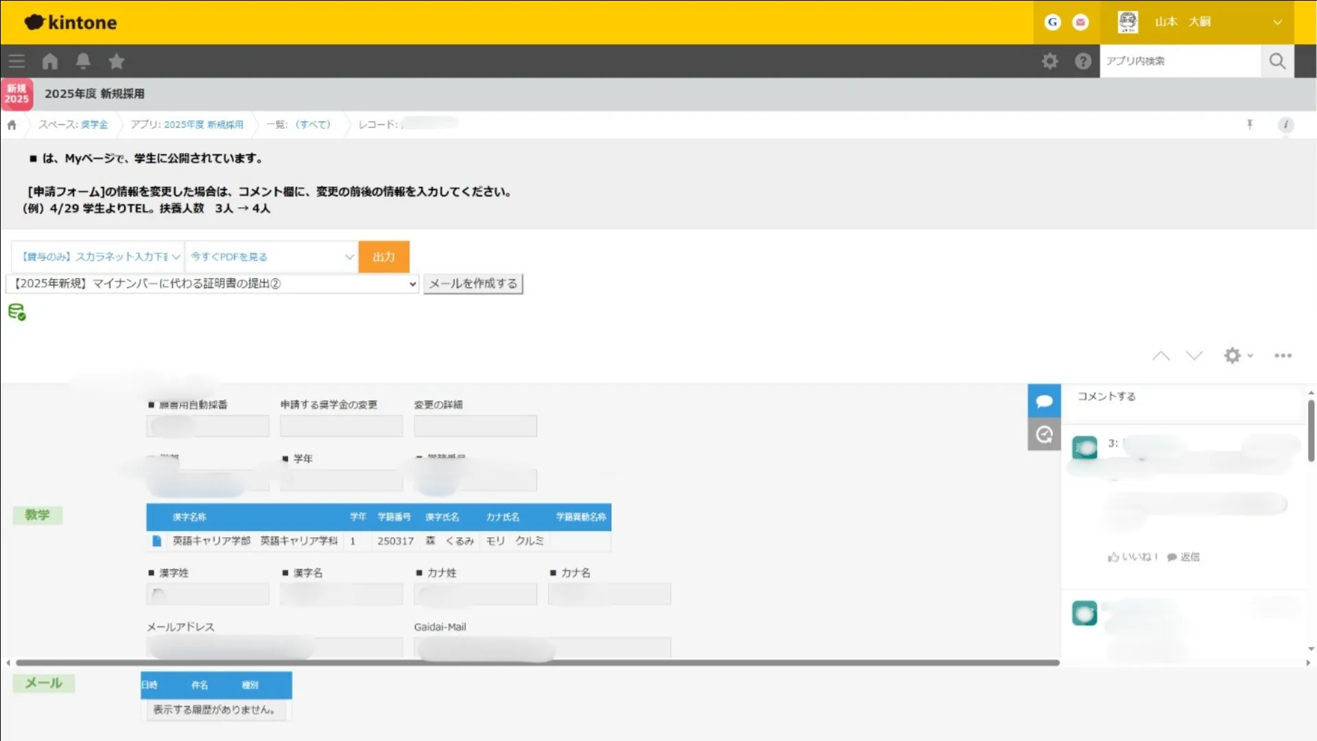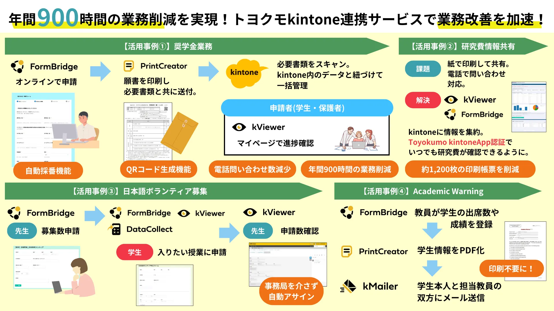 奨学金業務はkintoneとFormBridgeでオンライン申請、PrintCreatorで願書生成・QRコード連携による書類管理、kViewerで学生・保護者向け進捗確認マイページを構築
