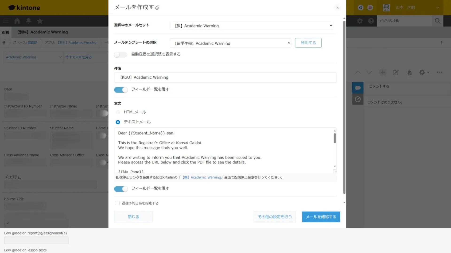 ▲Academic Warningの対象となった学生にはkMailerを使ってkintone上から通知メールを送信できる。