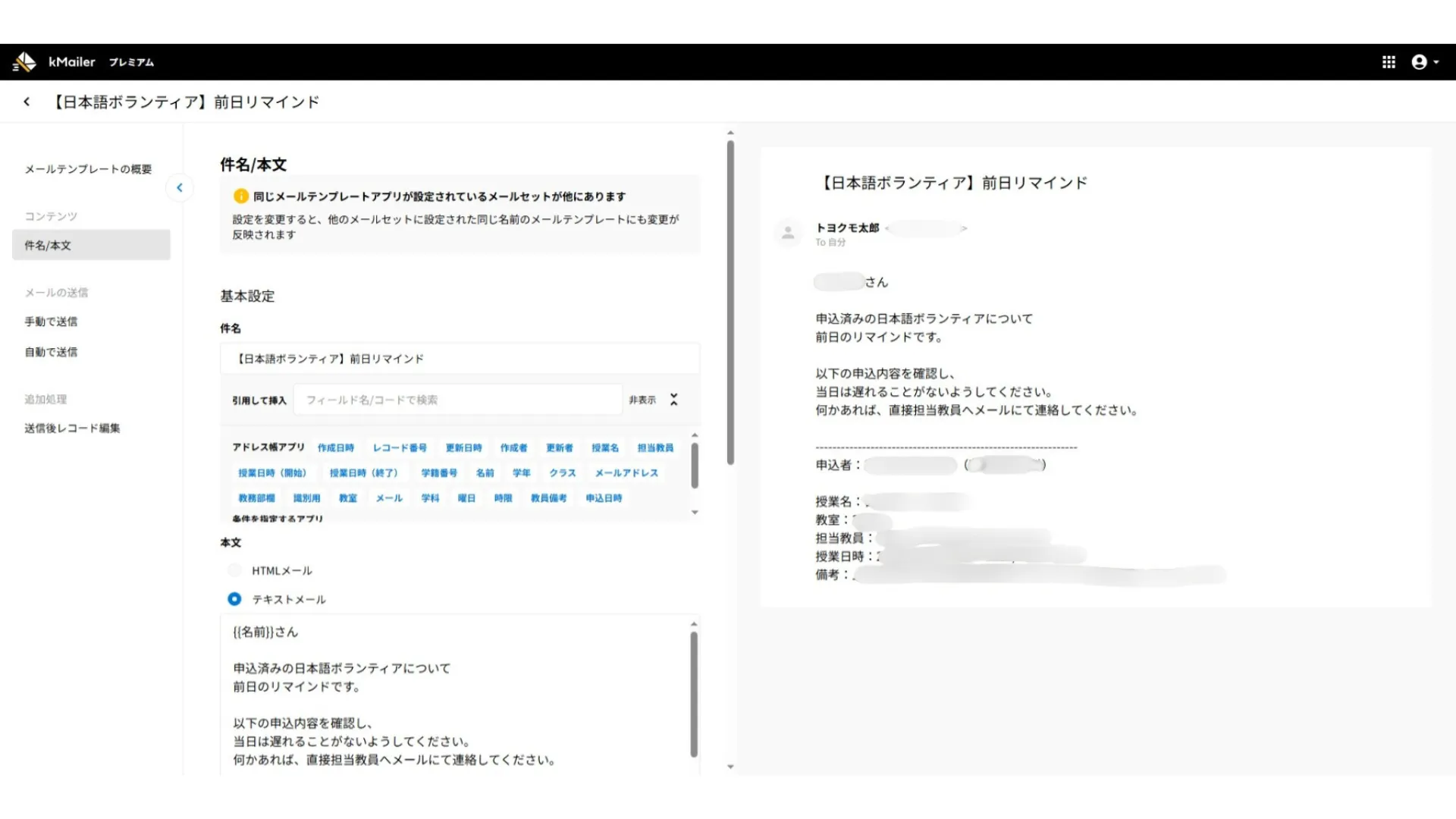 ▲kMailerのメール作成画面。学生の名前や必要情報は自動で入力されるように設定されている。