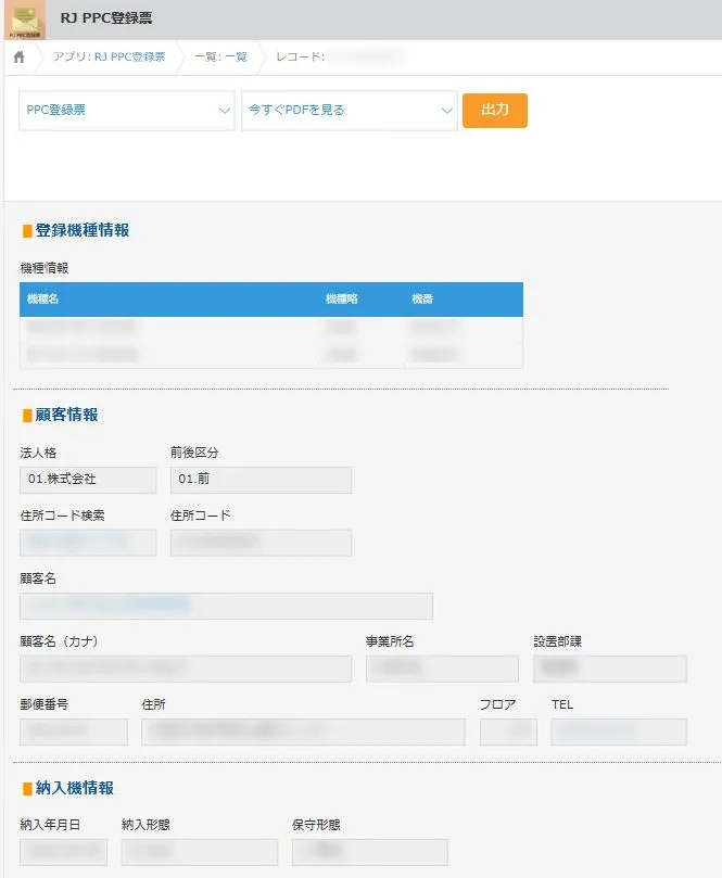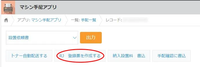 その後、kintoneのアクション機能で利用している「RJ 登録票を出力する」ボタンをクリック。マシン手配アプリとは別の登録票作成アプリへジャンプし、登録票を出力します。あえて別アプリに遷移させることで、各フローの履歴が残るように工夫しているそうです。