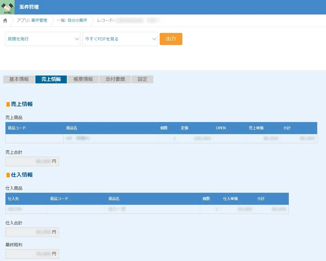 ▲案件管理アプリのレコード詳細画面。右上の「出力」ボタンをクリックすると、PrintCreatorによって帳票が出力される