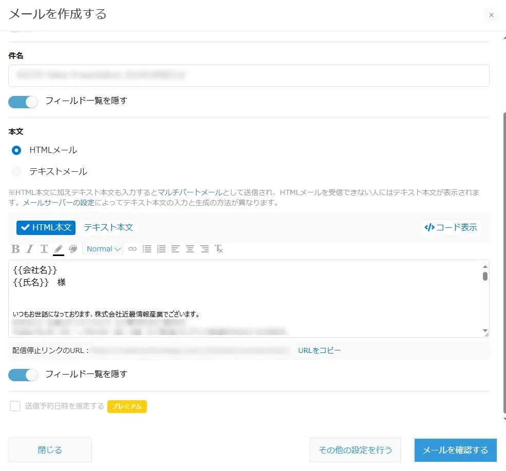 また、宛先ごとに可変する{{会社名}}や{{氏名}}はkintoneに登録している情報が自動で反映されるため、例えば100件に送信する場合でも、100通りの宛名を1クリックで作成することができます。