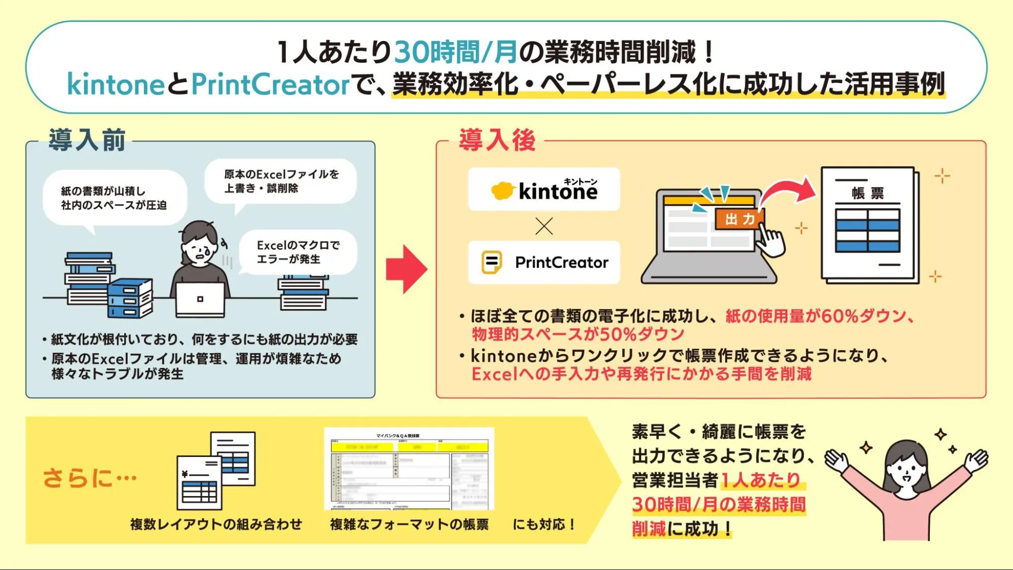 結果として、同社はkintoneとPrintCreatorの導入により、紙の使用量が約60%削減され、紙の保管に使用していた書庫のスペースも半減しました。