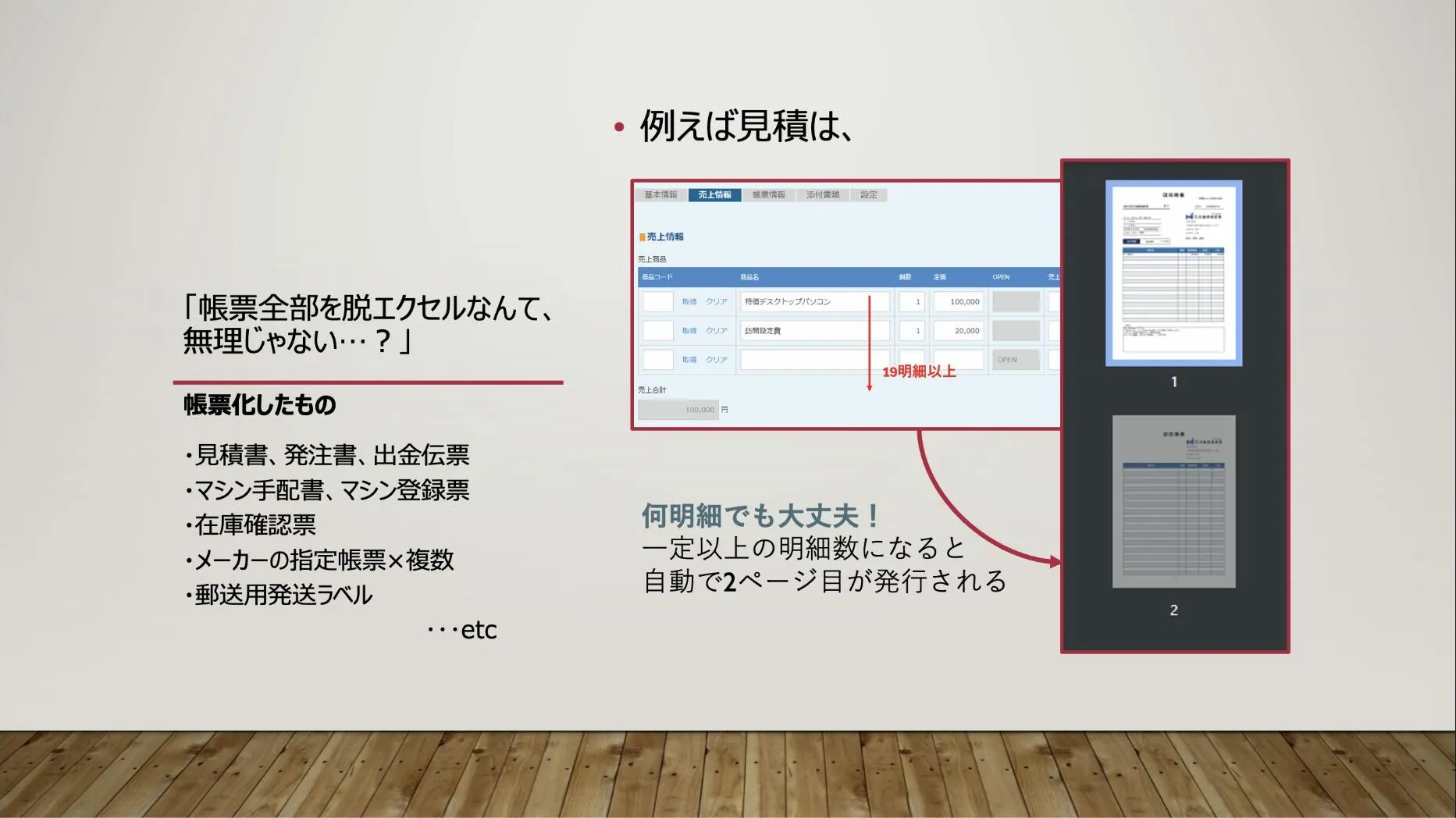 同社ではこの機能を活用し、1ページ目と2ページ目以降で異なるレイアウトを登録。合わせて「テーブル行数条件分岐(※)」を設定することで、明細の行数に応じて適切なページ数、レイアウトが自動的に選択される仕組みを構築しました。