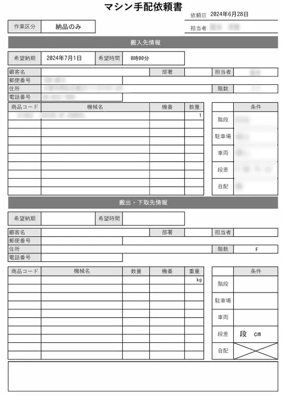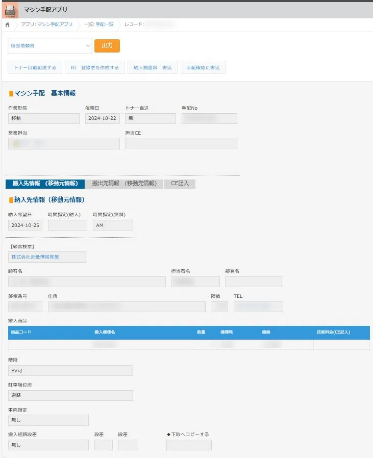 大型機器を納入する場合もあるため、納入先のエレベーターの有無や駐車場に関する情報も記載できるようになっている
