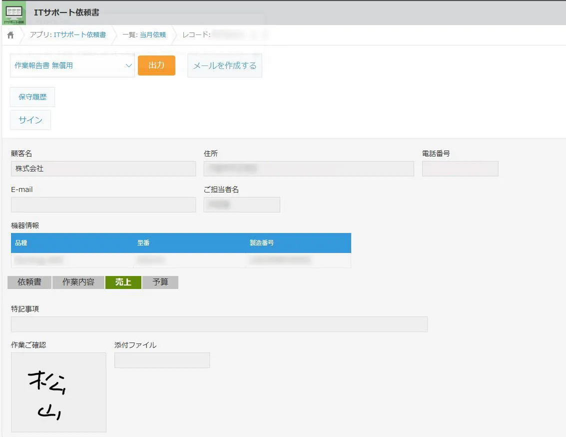 まず、ITサポート依頼書アプリに必要事項を入力します。その後、顧客にkintone上で手書き