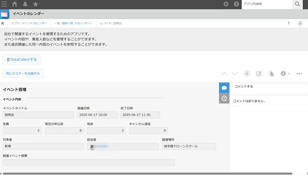 予約管理においては、『DataCollect』の活用により予約枠の自動制御を実現しました。例えば定員3名のコースに対して予約が入ると、残数が自動的に2に減算され、定員に達すると予約受付が自動停止する、という仕組みを構築。この制御により、ダブルブッキングのリスクを大幅に軽減しています。