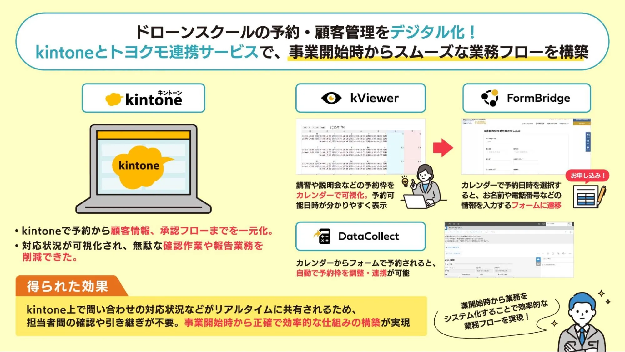 「操学館ドローンスクール」を運営する株式会社那須管財様は、事業の立ち上げと同時に、顧客情報やスクール講座の予約情報といったさまざまな情報管理のために、kintoneとToyokumo kintoneAppを導入しました。
