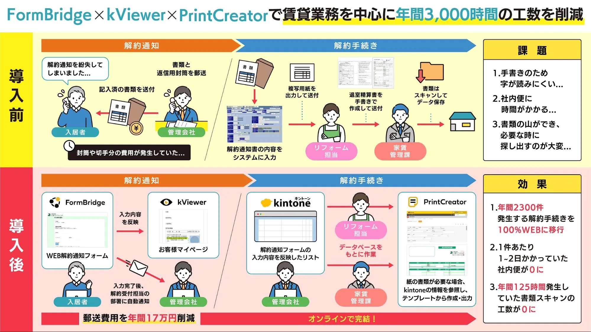 同社において大きな課題となっていた解約手続きについて、FormBridgeとkViewerを活用して電子化を図りました。