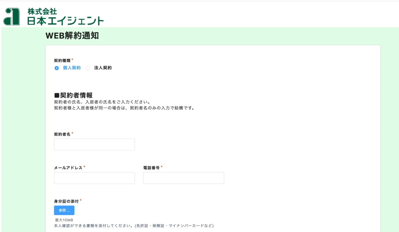 まず、解約通知書を郵送する手間を省くため、FormBridge「WEB解約通知フォーム」を作成。契約種類(個人・法人)や契約者情報(氏名、メールアドレス、電話番号など)、物件情報(物件名、住所)といった情報は全てフォーム上で入力できるよう設定しました。
