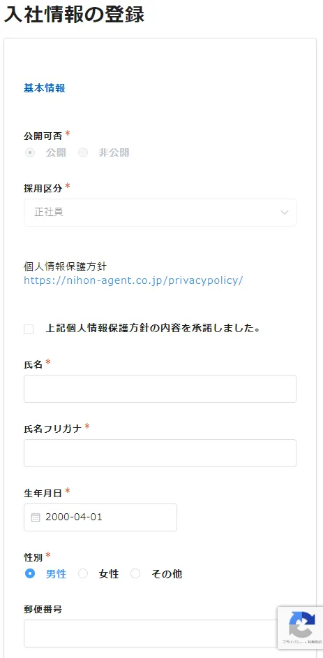 ▲FormBridgeで作成した入社情報の登録フォーム