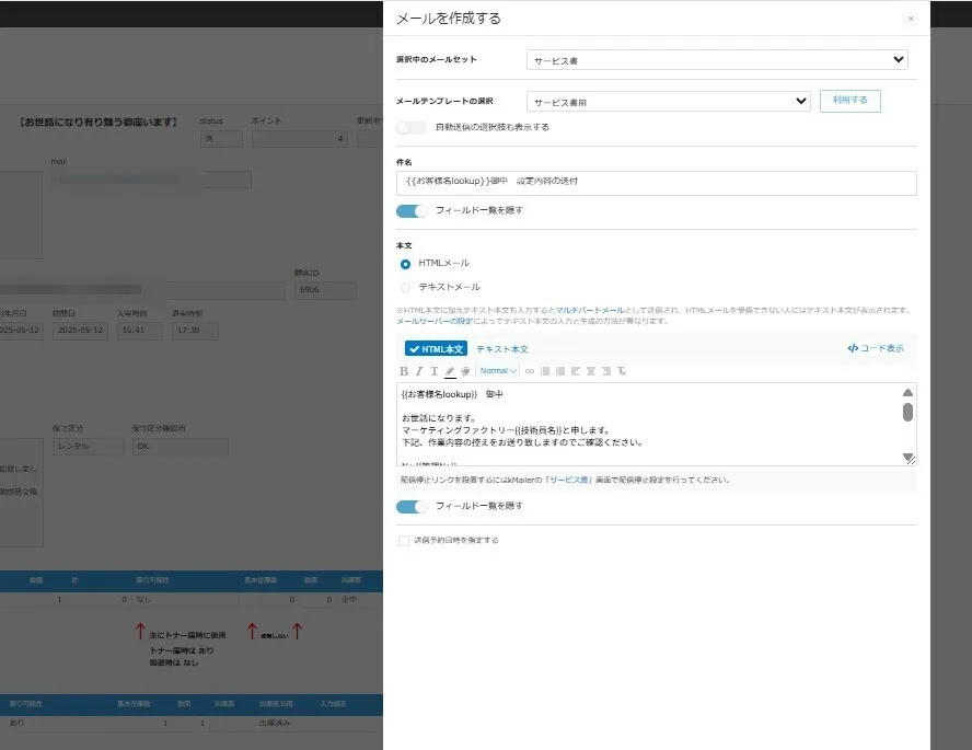 さらに作業完了後には『kMailer』で顧客へサービス書のメール送信が可能になりました。