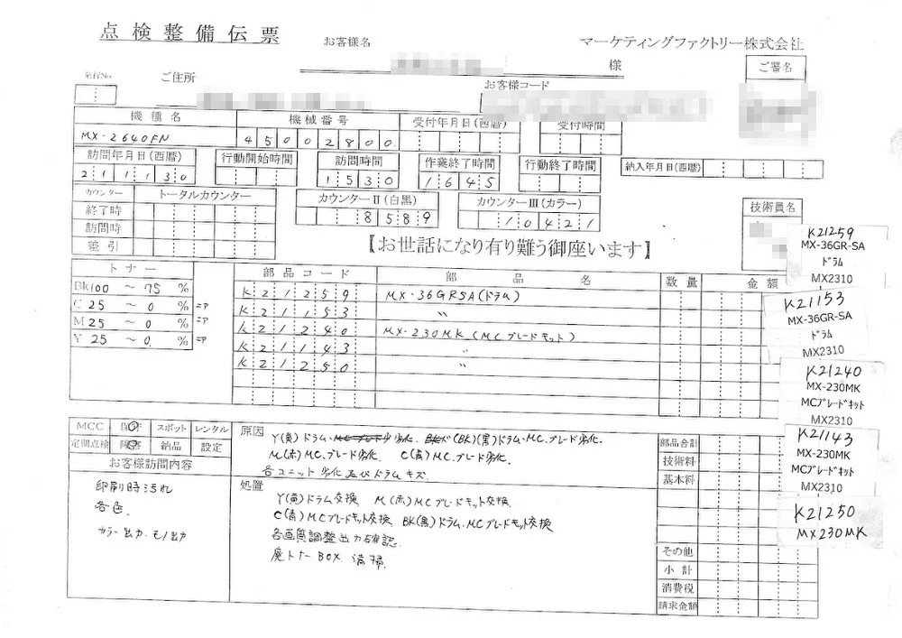 ▲修理や使用部品といった顧客対応内容を記録している紙のサービス書