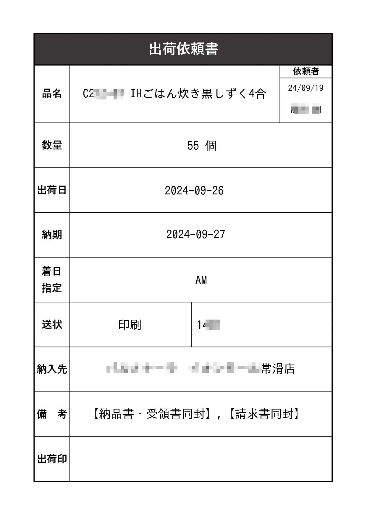▲PrintCreatorで出力した出荷依頼書。加工依頼書と同様に商品リストアプリと連携しているため、商品や納入先の情報の記入ミスが発生しない