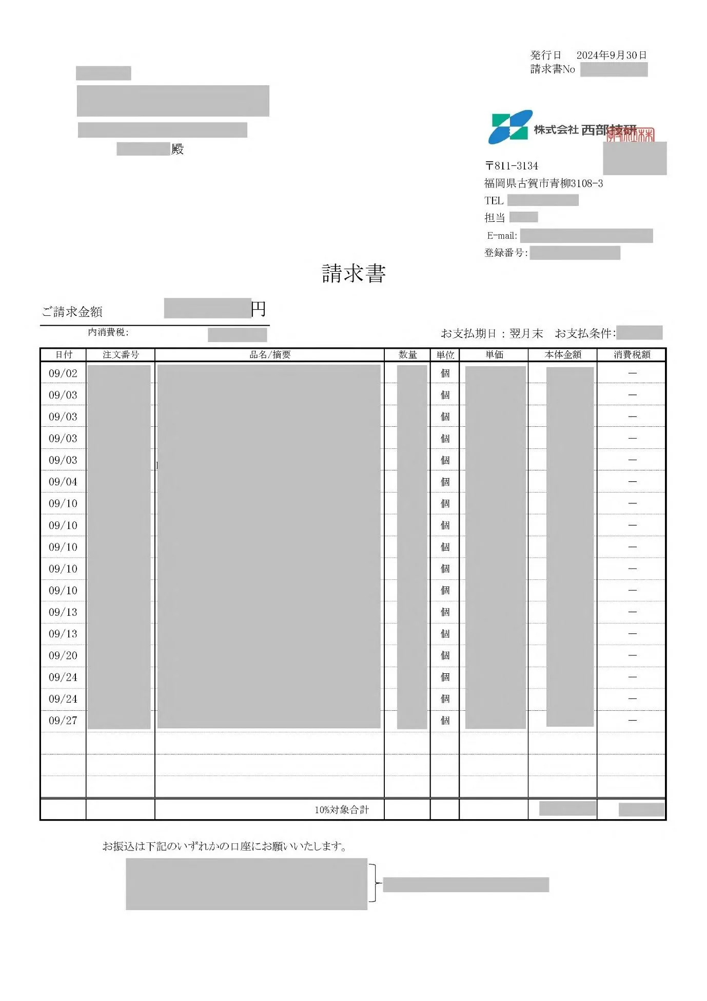 西部技研では会計システムから請求データをいったんCSV経由でkintoneに取り込み、PrintCreatorで帳票を出力、kMailerでメール送付を行っています。また、郵送での受領をご希望されるお客様にはPrintCreatorの一括出力を利用して出力しています。