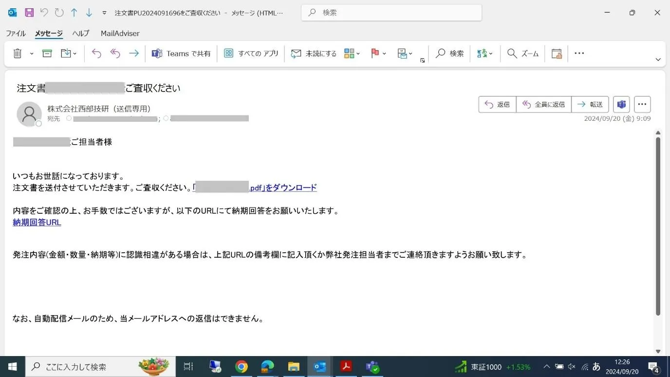 西部技研では取引先への注文書送付にPrintCreatorとkMailer、納期回答の際にkViewerとFormBridgeを活用しています。