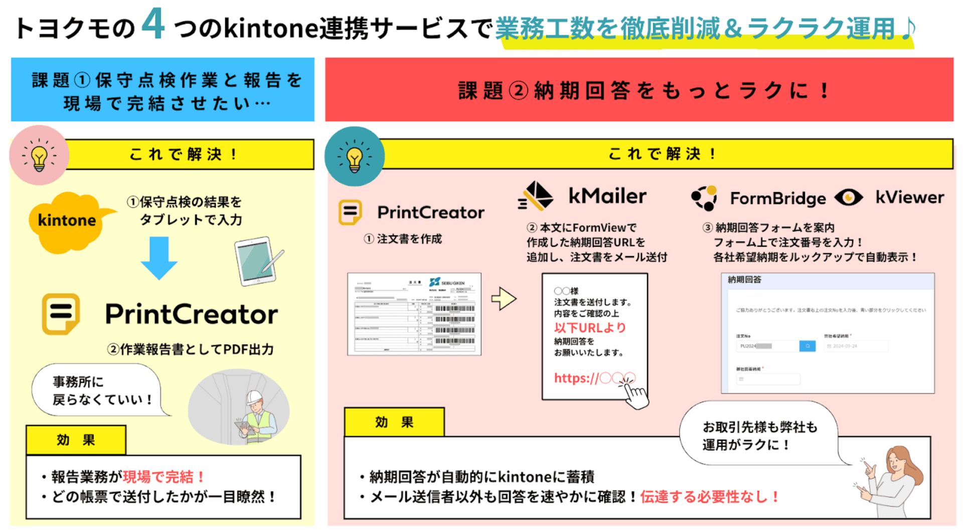 kintone導入から程なくして「PrintCreator」を皮切りに、4つのトヨクモのkintone連携サービスの利用をスタートさせた西部技研。最初に導入したPrintCreatorの使い勝手が良かった点に加え、SEがいなくても一気通貫で簡単に管理できる点から、その他3製品もスムーズに導入することができたとのことです。なかでも3つの事例で大きな効果を感じているそうです。それぞれの活用方法や効果についてご紹介してまいります。