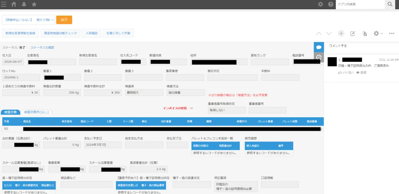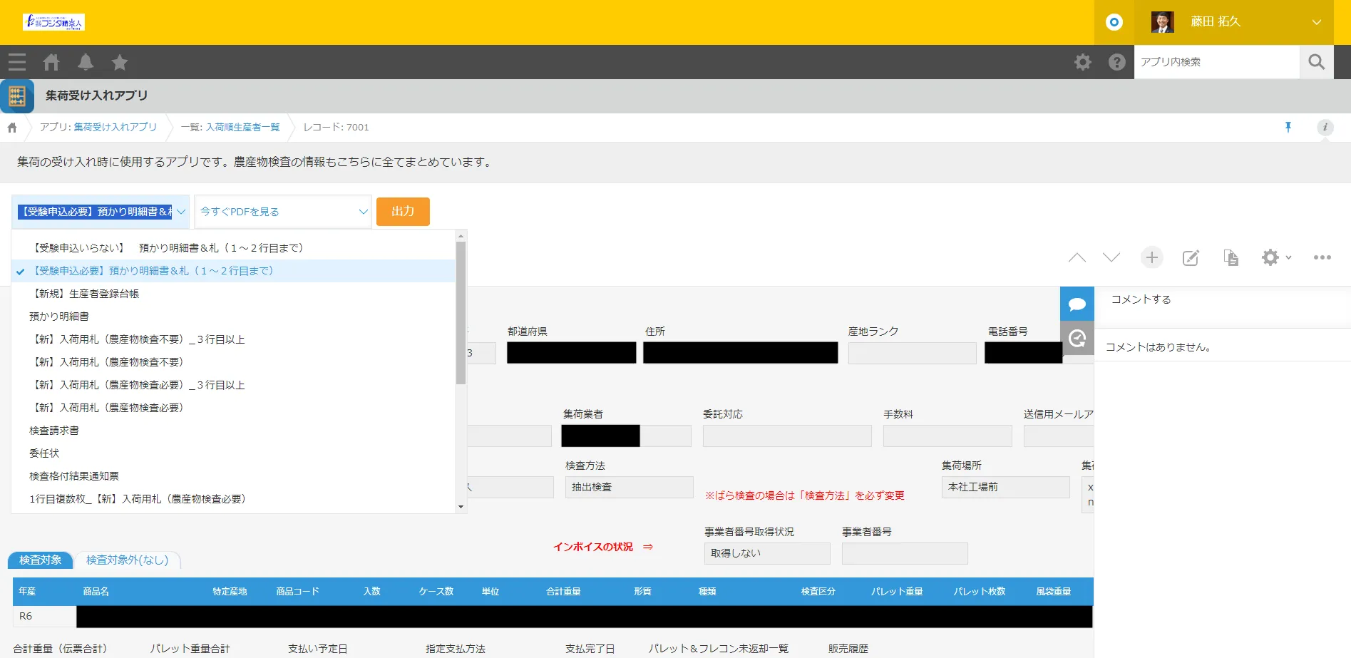 ▲kintoneの荷受管理アプリの画面。農家の方のお名前や品名などがルックアップで表示されるようになっている。