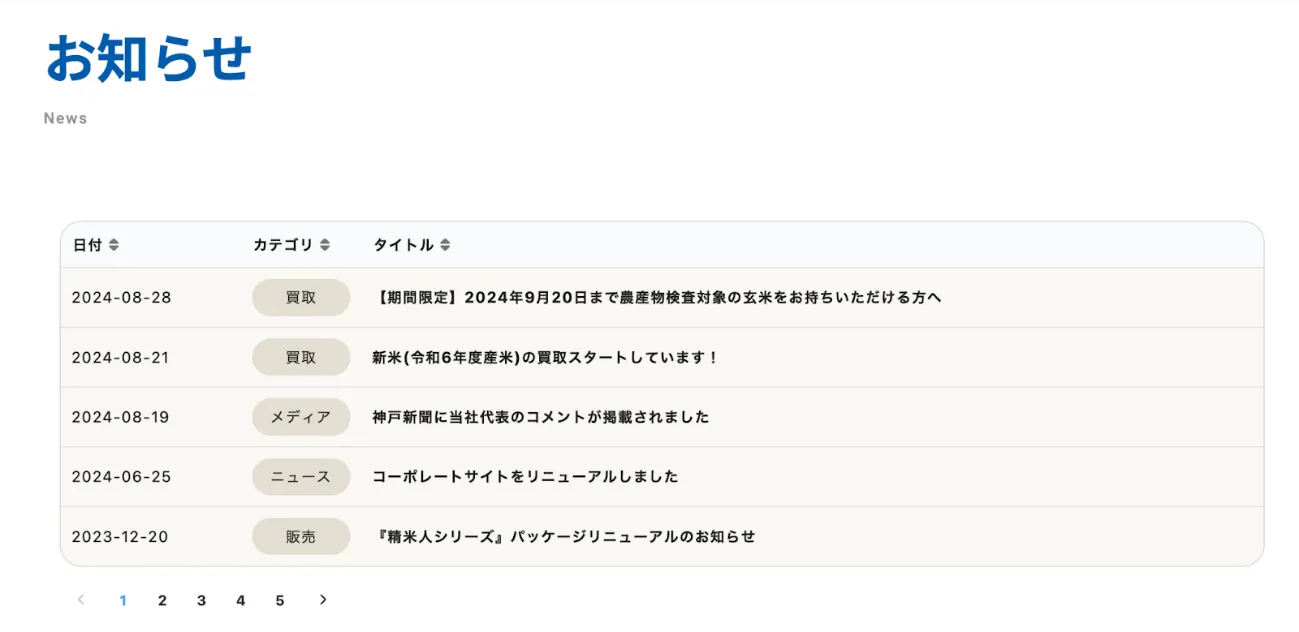 ▲コーポレートサイトの新着一覧。社員が使い慣れているkintoneでお知らせ内容を入力し、kViewerでその情報を掲載することができる(出典:フジタ精米人コーポレートサイト)