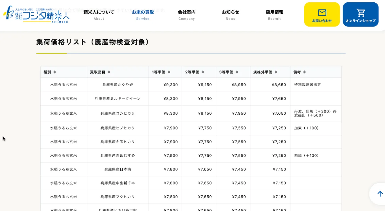 ▲kViewerで作成した米の集荷価格リスト。農産物検査対象品とそれ以外に分けられているなど、掲載時の見やすさや農家の方の探しやすさにも配慮されている(出典:フジタ精米人コーポレートサイト)