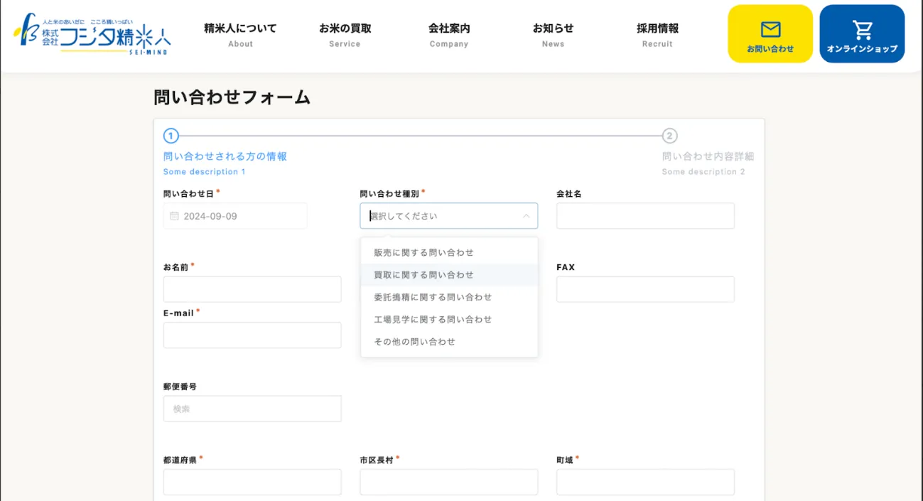 ▲問い合わせフォーム画面。入力内容や問い合わせ種別を細分化することで自動送信されるロボット営業メールが激減した(出典:フジタ精米人コーポレートサイト)