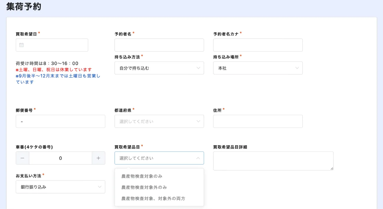 ▲集荷予約フォーム画面。希望品目や持ち込み方法などがあらかじめ確認できるので、荷受全体の業務改善につながることが期待されている(出典:フジタ精米人コーポレートサイト)