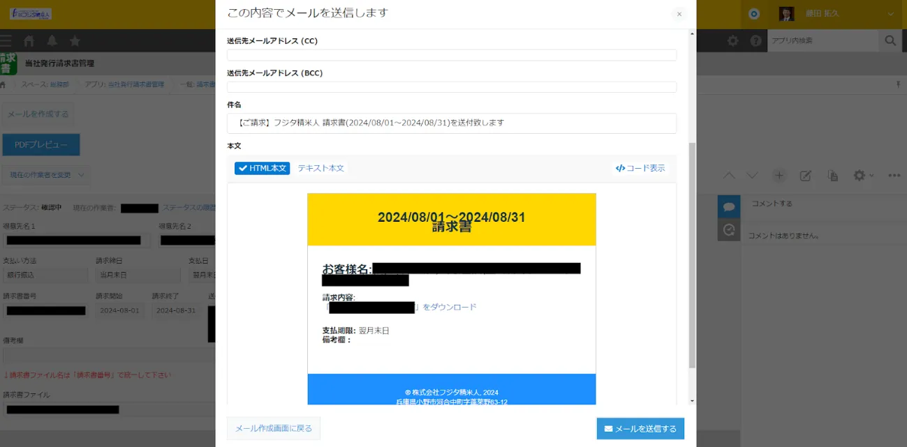 フジタ精米人ではこれまで請求書の送付について、封入から発送までを外注していました。しかし一部届かない請求書があったほか、2024年10月には郵便料金が値上がりすることを受け、自社で対応できないかという話が上がったといいます。そこで活用されたのがkMailerです。